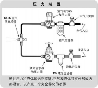 空气雾化喷嘴特殊的内部结构设计能使液体和气体均匀混合,产生微细液滴尺寸的喷雾或粗液滴喷雾。通常,通过增加气体压力或降低液体压力可得到更加微细(30微米左右)的液滴喷雾,从而导致较高的气体流率与液体流率比。