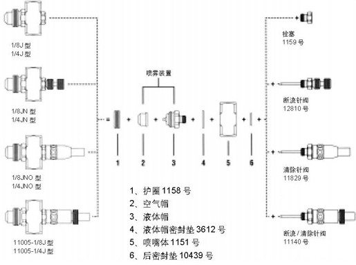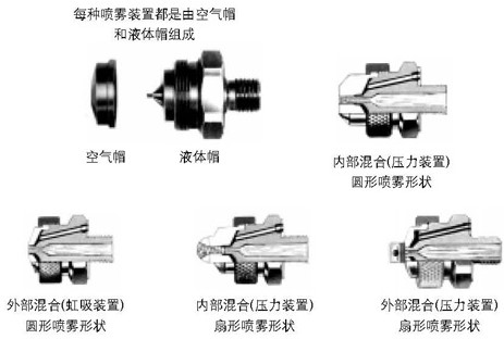 每一种喷雾装置均由空气帽和液体帽组成,能够提供扇形和圆形两种喷雾模式,并有着广泛的流量范围。喷嘴体的入口接头有多种尺寸,适合大多数常用的管道。以上喷嘴部件可以互换,这为得到不同的喷雾性能提供了灵活机动性。